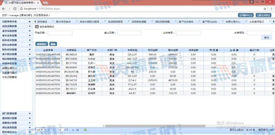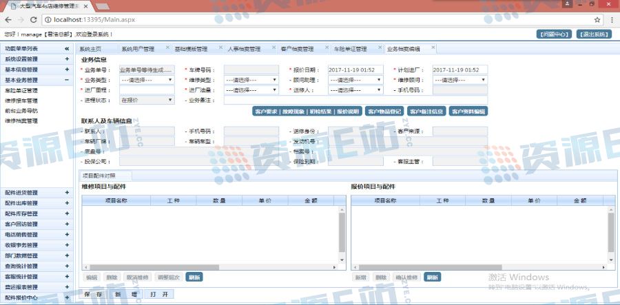 基本信息管理:人事档案管理、客户档案管理、车辆档案管理、维修项目管理、维修项目分类管理、维修配件管理、维修配件分类管理、车辆厂牌车型管理、供应商档案管理、客户档案管理_电销、车辆档案管理_电销;