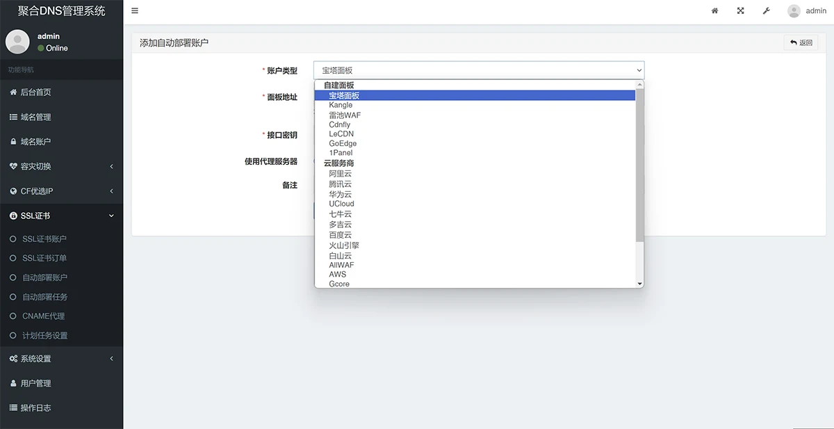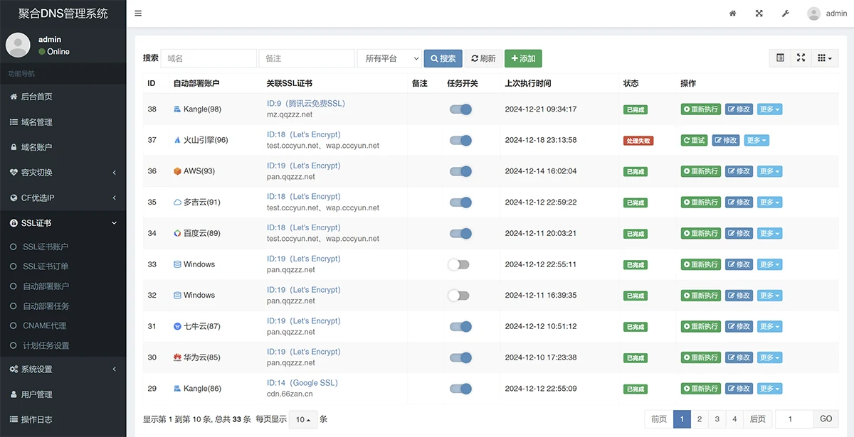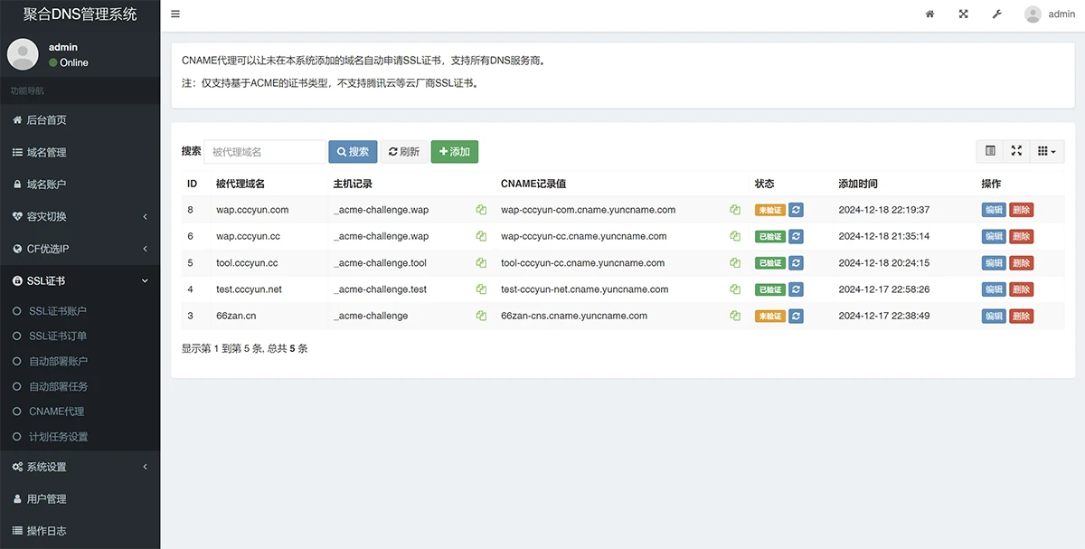 彩虹聚合DNS管理系统 V2.0.1 版本已更新,该版本新增SSL证书申请与自动部署功能,支持从Let’s Encrypt等渠道申请SSL证书,并自动部署到各种面板、云服务商、服务器等,支持CNAME代理功能。