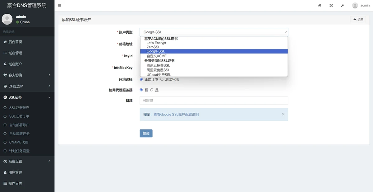 Let’s Encrypt、ZeroSSL、Google SSL、自定义ACME、腾讯云免费SSL、阿里云免费SSL、UCloud免费SSL…