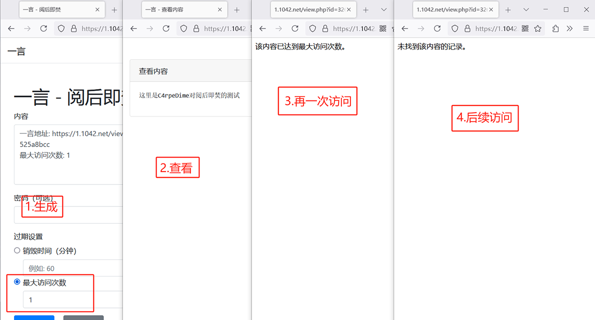 3.查看:用户通过唯一链接查看内容,并根据条件自动销毁。