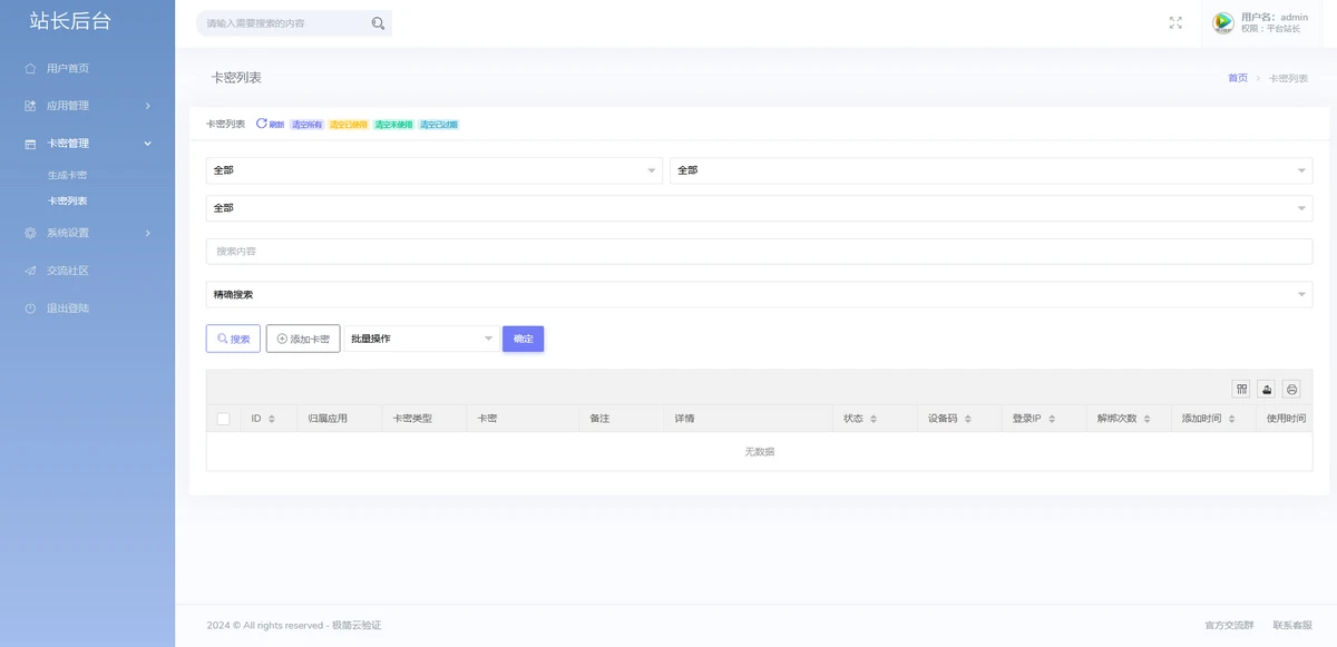 卡密管理 卡密长度 卡密封禁 批量生成 批量导出 自定义卡密前缀等